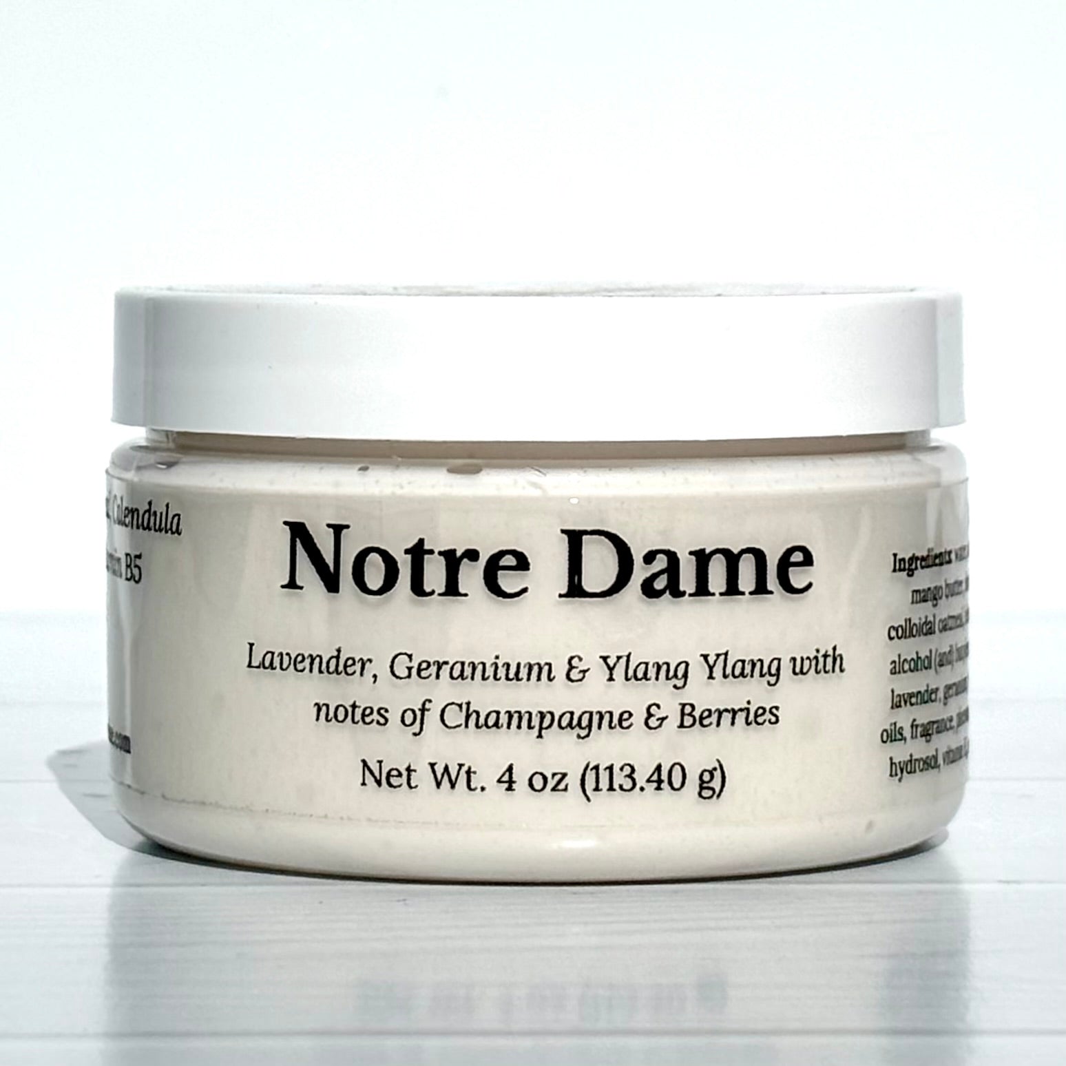 Ingredients: water, aloe vera liquid, safflower oil, jojoba oil, mango butter, shea butter, cocoa butter, avocado oil, colloidal oatmeal, behentrimonium methosulfate (and) cetyl alcohol (and) butylene glycol, emulsifying wax NF, glycerin, lavender, geranium, ylang ylang, pink grapefruit essential oils, fragrance, phenoxyethanol (and) ethylhexylglycerin, vitamin E, calendula extract, rose water hydrosol, panthenol, allantoin